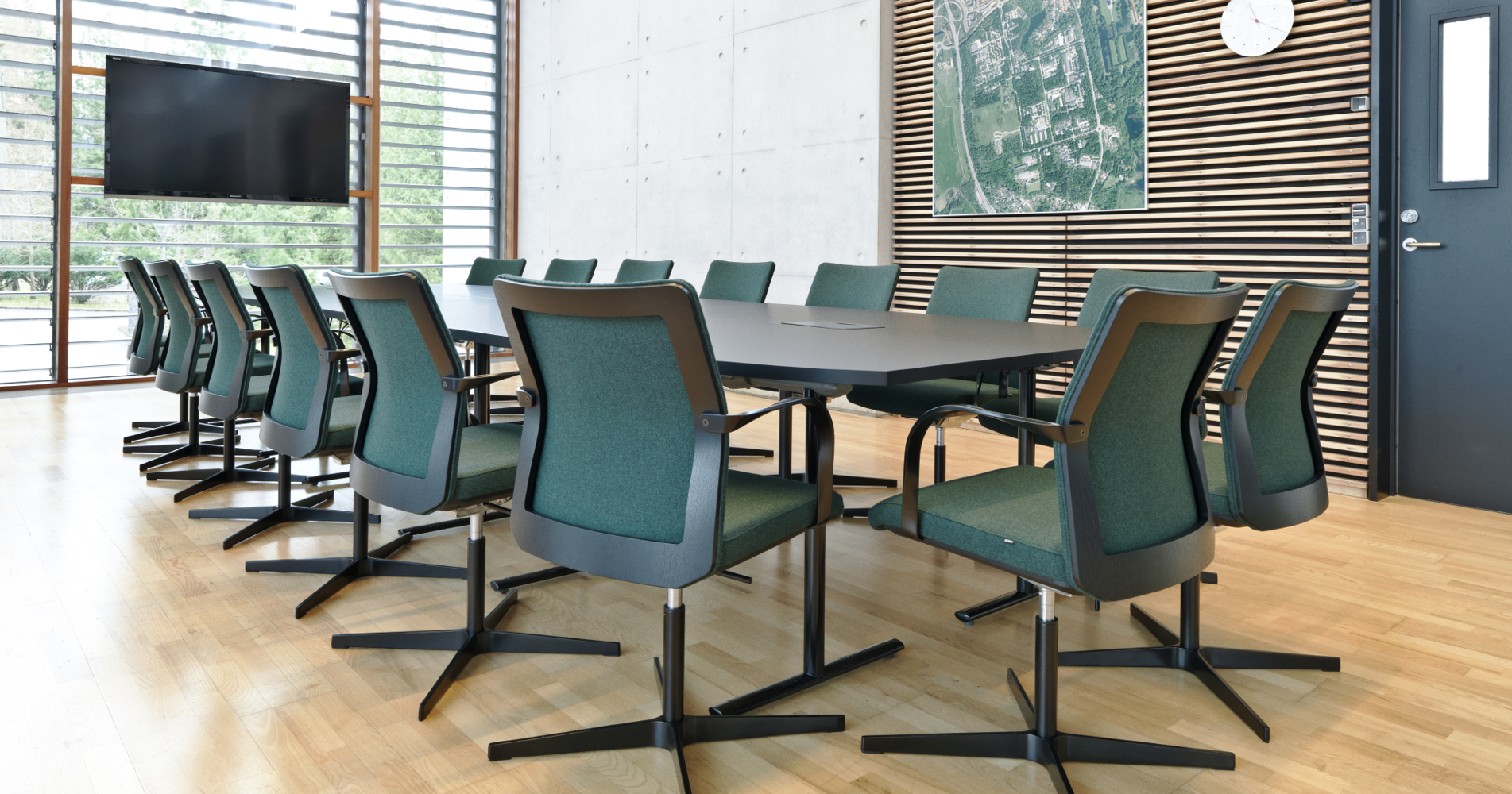 “The room is the most transparent conference room and a natural choice for e.g. boardroom meetings. We wanted an exclusive look and a product offering, which could bring the nature inside the transparent glass walls.”