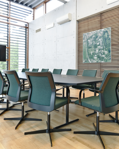 The choice was the MN1 conference chair with the exposed veneer back upholstered in forest green textile. The chair was combined with modular Tempest tables adapted in shape and size to maximise seating capacity within the room.