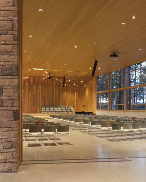 For Portland-based architectural studio Hacker, the greatest guiding force in the design of the UUFCO building was the landscape around it. Its 22-acre site, anonymously donated to the church in 2011 and volcanic high desert in character, features a grove of Ponderosa pines that the building was constructed to orientate around. The ground around it was also returned to its native wild state to avoid it looking too landscaped.