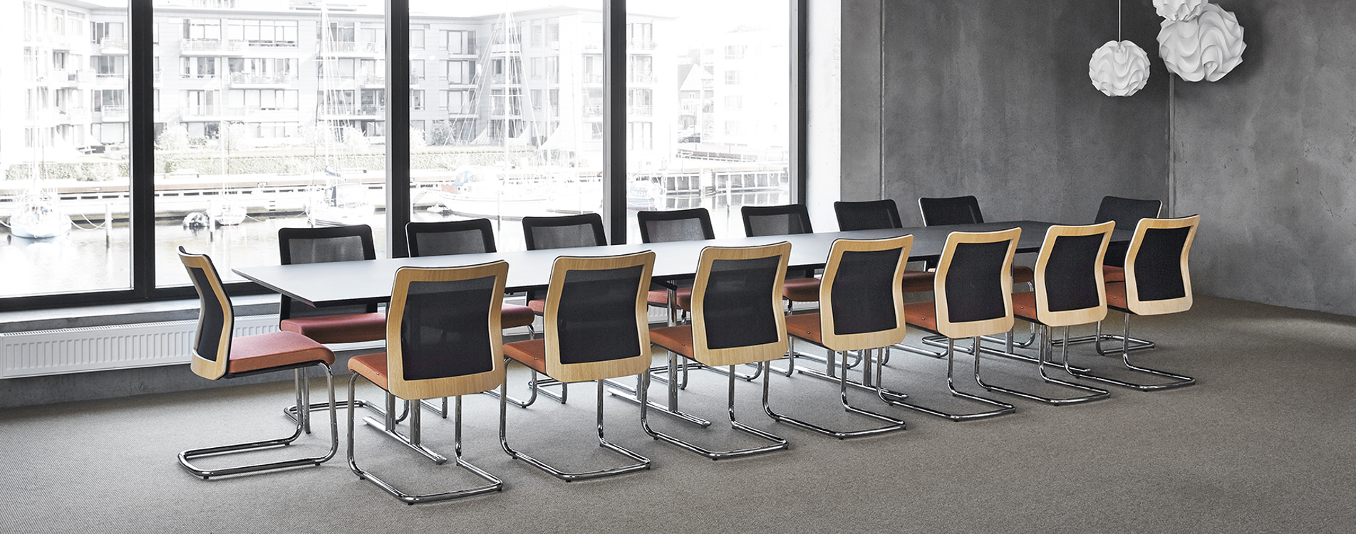 Whenever comfort, classic lines, and functionality are vital, the MN1 cantilever side chair is the obvious choice. Exposed veneer back frame. Back in mesh or front upholstered. Two different back heights.