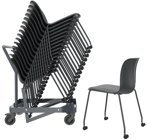 Polypropylene and with upholstered seat pad: up to 15 chairs on dolly and 5 on the floor.