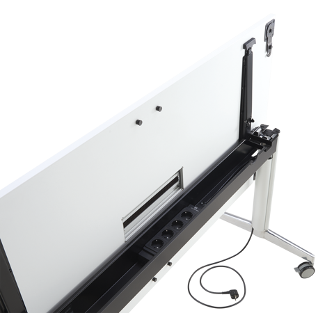 Moveo is a mobile flip-top table system for training, meeting, and conferencing use with an integrated solution for concealed cabling. Inverted T-leg style. Rectangular, half-round, or V-shape tabletops in several sizes. Tables can be nested when not in use.