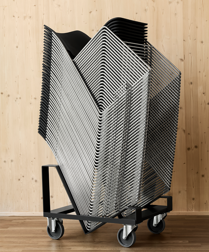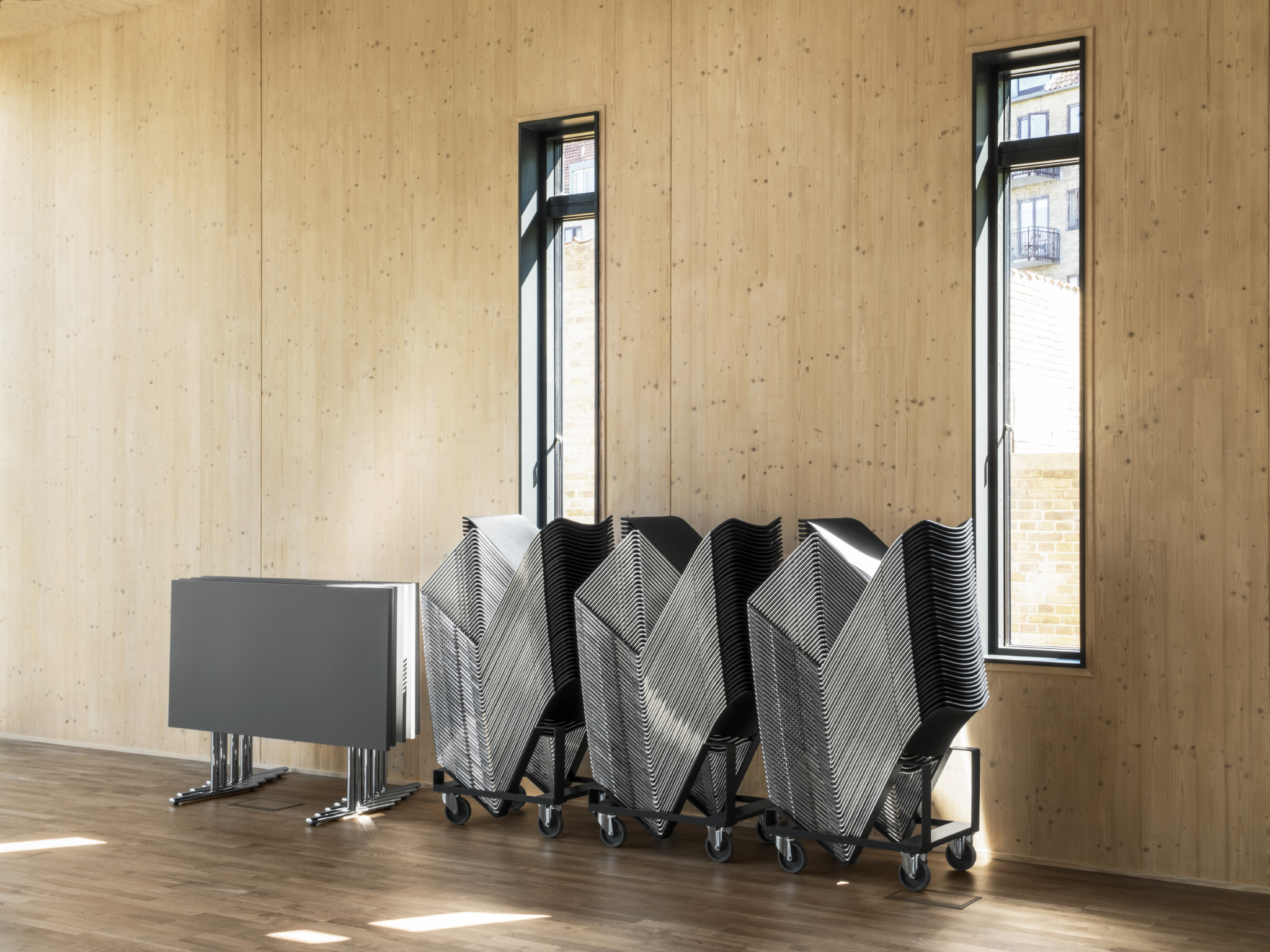 Dalgaard's request for the furniture was straightforward: "Lightweight and solid furniture that takes up as little space as possible when stacked — these are important factors, as we daily reconfigure the room."