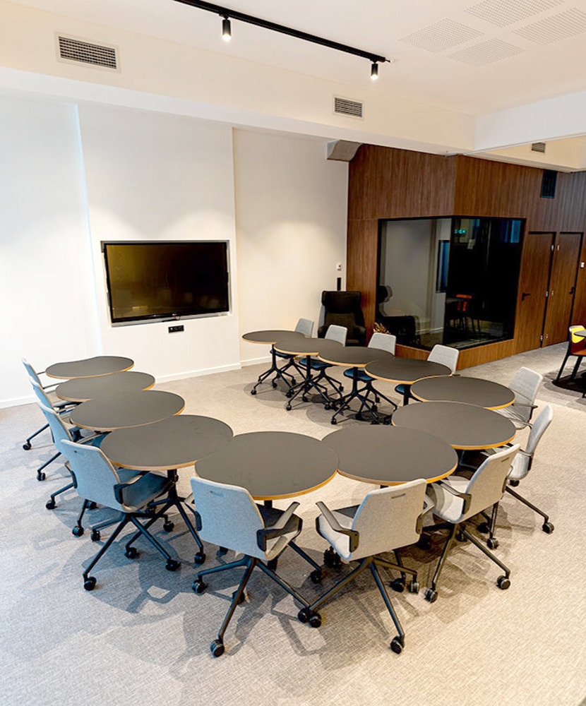 The challenge was clear: furnish the space with products that could seamlessly shift between multiple configurations, from small group discussions to large collaborative sessions, while ensuring comfort and aesthetic appeal.