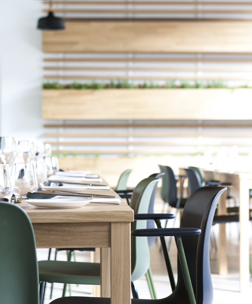 The overall inspiration was to create a warm, simple yet elegant environment that would engage all the senses. The restaurant is used both in a conventional sense as well as for symposia and meetings. Therefore, flexibility, lightness, and sturdiness were important factors in choosing the right furniture. Another crucial requirement was sustainable manufacturing. When asked how important design and quality would be in the project, Christien responded: “Very important. We were looking for simple, clean lines and preferably ‘green’ manufacturing in Europe”.