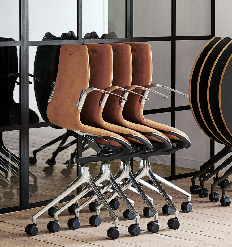 All nesting tables and chairs in the AS series come with a mobile wheel-base. With a light “push,” you can create new furnishing dynamics that maintain a harmonious design language throughout your interiors.