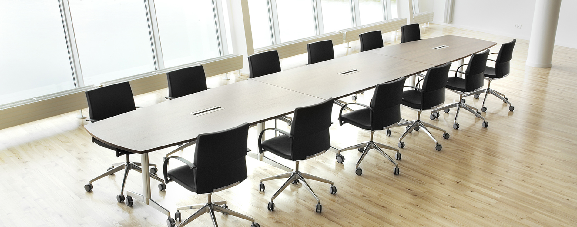 Moveo is a handsome table system that encourages organizations to develop a dynamic corporate culture. Inverted T-leg style. Rectangle, half boat, or full boat shape tabletops in several sizes. Tables can be nested when not in use.