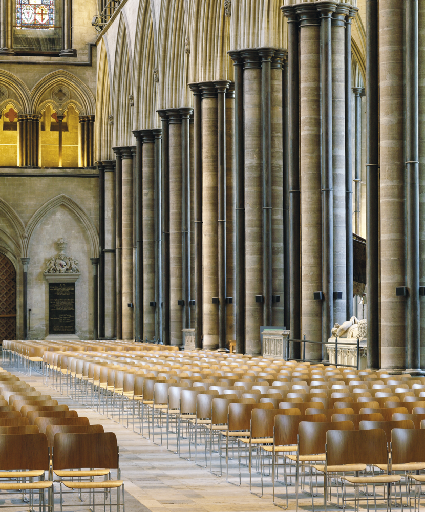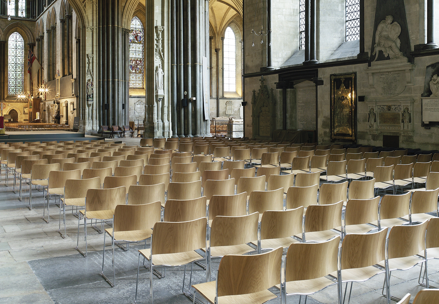 APPLICATION. The Salisbury Cathedral solution embraces a total of 1800 chairs, all in the English oak edition. The majority are placed in the Cathedral main nave in rows of 16 chairs, eight on each side of a central isle. The HOWE 40/4 seating system extends throughout the building. The replacement of the old seating was completed in 2005.