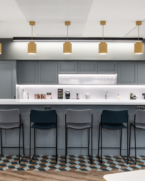 The tea point and breakout areas, convivial atmospheres of social interaction, feature upholstered counter-height 40/4 barstools. Drawing inspiration from the iconic 40/4 chair, these barstools offer a harmonious blend of elegance and minimalism. With narrow seats and a subtle recline, they offer optimal comfort for relaxed gatherings, casual work sessions, or client engagements. The versatility of the 40/4 chairs, with their stackable design for easy storage and rearrangement, enables the space to accommodate town hall meetings and large presentations as needed.