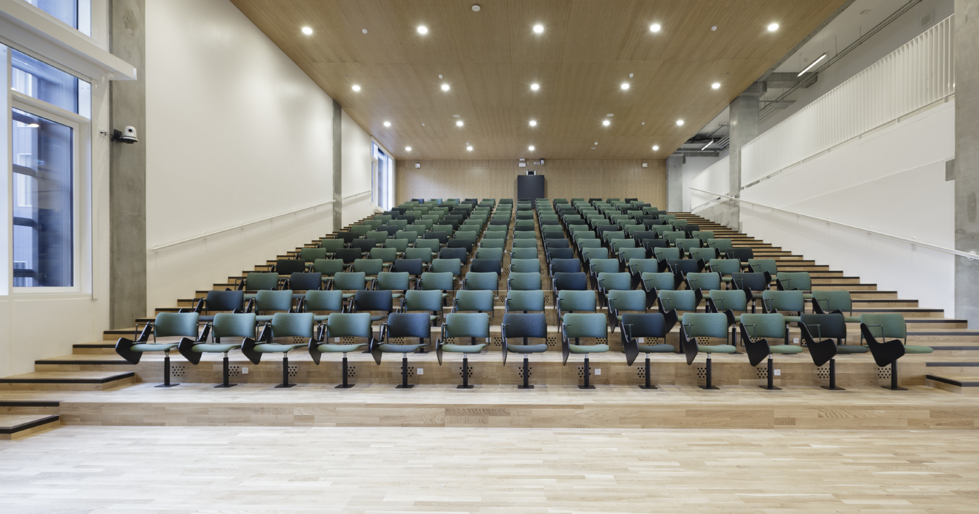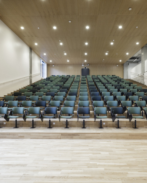 For this project, HOWE delivered 600 40/4 chairs in several different versions to the new campus, most of which were customized auditorium chairs. But JJW Architects, whose team we were supporting, not only needed an auditorium chair with an attached foldaway writing table, they needed a chair that could come in many fabrics and finishes.