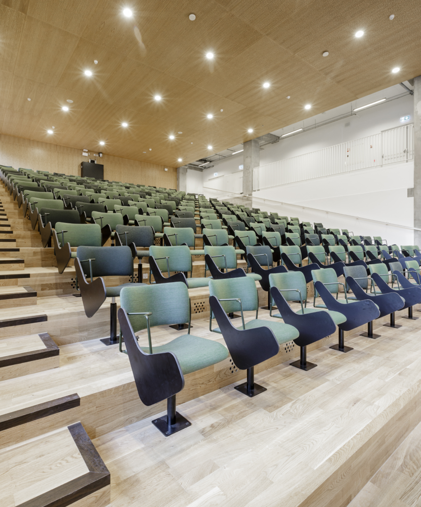 For this project, HOWE delivered 600 40/4 chairs in several different versions to the new campus, most of which were customized auditorium chairs. But JJW Architects, whose team we were supporting, not only needed an auditorium chair with an attached foldaway writing table, they needed a chair that could come in many fabrics and finishes.
